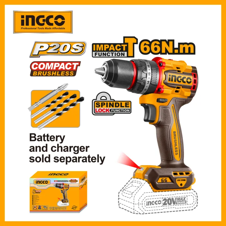 INGCO 20v Compact Brushless Cordless Drill Without Battery & Charger for professional and DIY use.